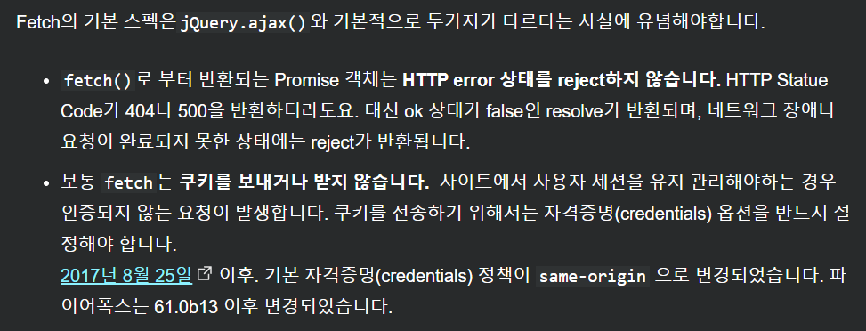 POST 방식으로 보낸 데이터를 처리하는 방법이 기존의 ajax, xhr과 차이가 있다