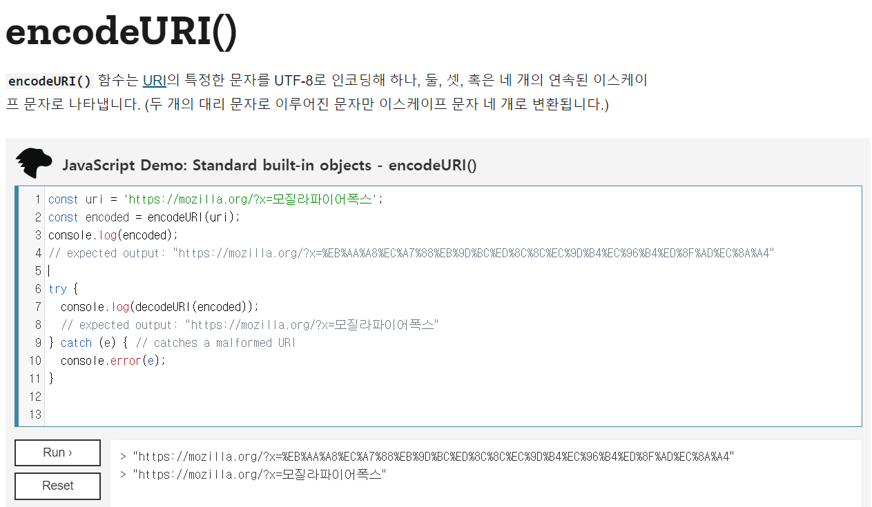 https://developer.mozilla.org/ko/docs/Web/JavaScript/Reference/Global_Objects/encodeURI
