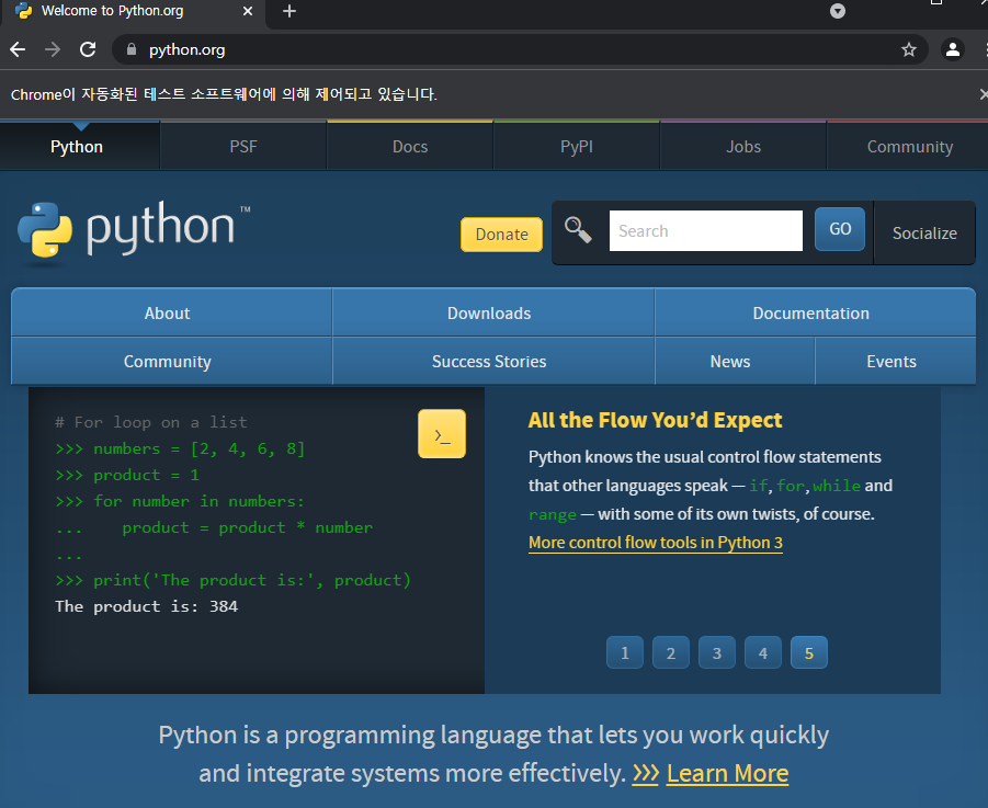 셀레니움으로 브라우저 창을 띄우면 자동화된 테스트 소프트웨어에 의해 제어되고 있다는 문구도 확인이 가능하다