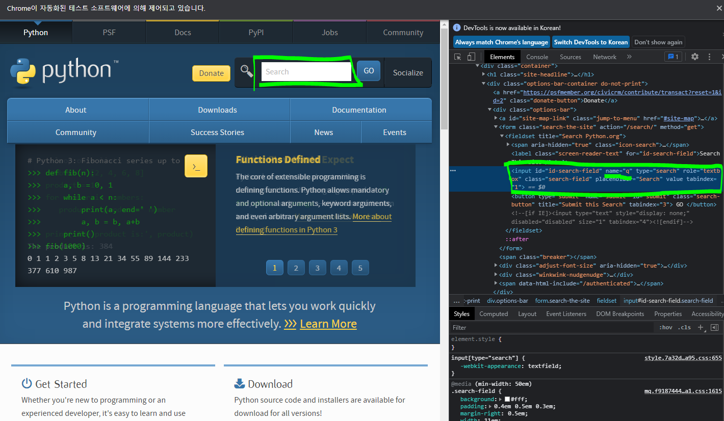 f12를 눌러 HTML 엘레먼트 리스트에서 검색어 입력을 받는 DOM을 찾아 특정 값을 입력해준다