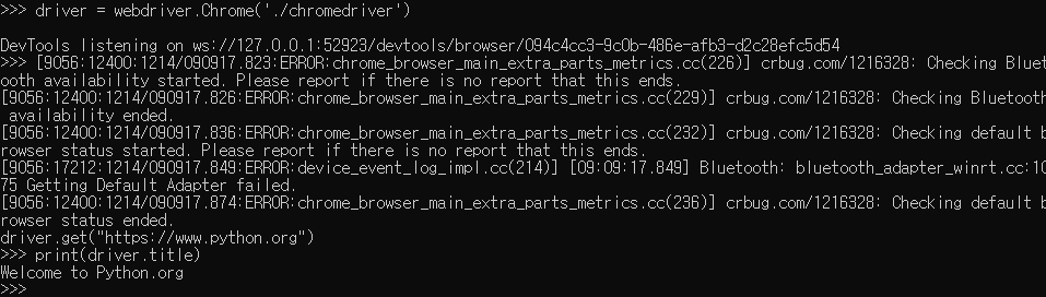 4. 입력한 페이지 로드가 완료됐다면 .title 속성을 사용하여 웹페이지 제목 텍스트를 출력해볼수있다