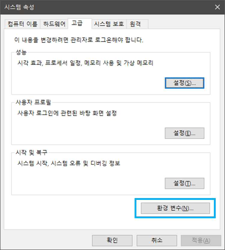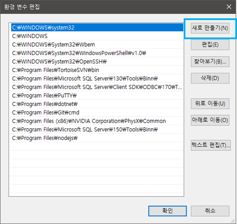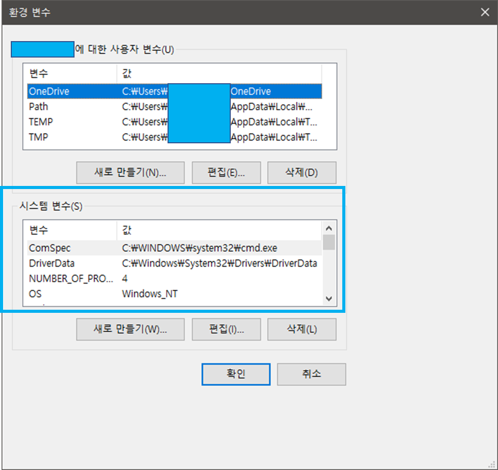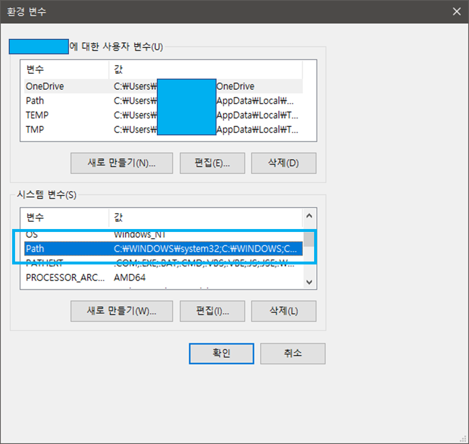 아래쪽의 시스템 변수에서 변수명이 Path인 곳을 찾아 더블클릭 또는 편집 ㄱㄱ