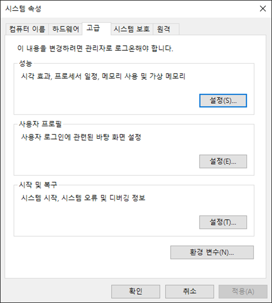 나온 화면의 우측에서 고급 시스템 설정을 눌러준다