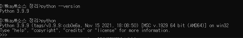 python 입력 후 위의 화면처럼 바뀐다면 환경변수 세팅이 완료된 것임