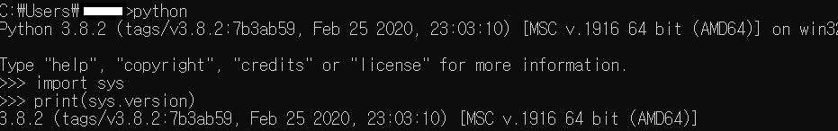 위의 2가지 방법으로 내가 설치한 파이썬 버전3.8.2인것을 알수있다